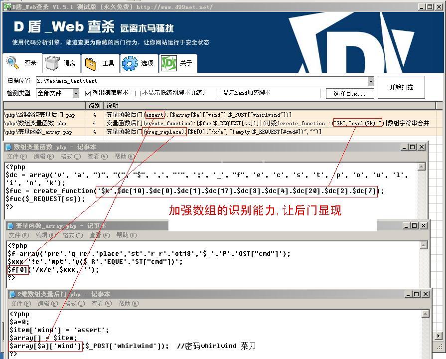 軟件使用自行研發不分擴展名的代碼分析引擎,能分析更為隱藏的WebShell后門行為。引擎特別針對,一句話后門,變量函數后門,${}執行 ,`執行,preg_replace執行,call_user_func,file_put_contents,fputs 等特殊函數的參數進行針對性的識別,能查殺更為隱藏的后門,并把可疑的參數信息展現在你面前,讓你能更快速的了解后門的情況新版特別針對 dedecms 的{dede:php}{/dede:php}代碼加入了識別!