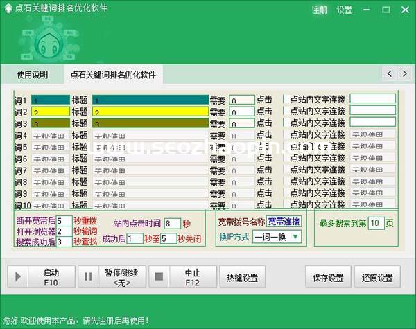打開點石關鍵詞排名優(yōu)化軟件,添加需要提高排名的關鍵詞、需要提高排名的網(wǎng)站或域名、站內(nèi)二次點擊文字或鏈接,并可根據(jù)自己的寬帶速度設置點擊時間。